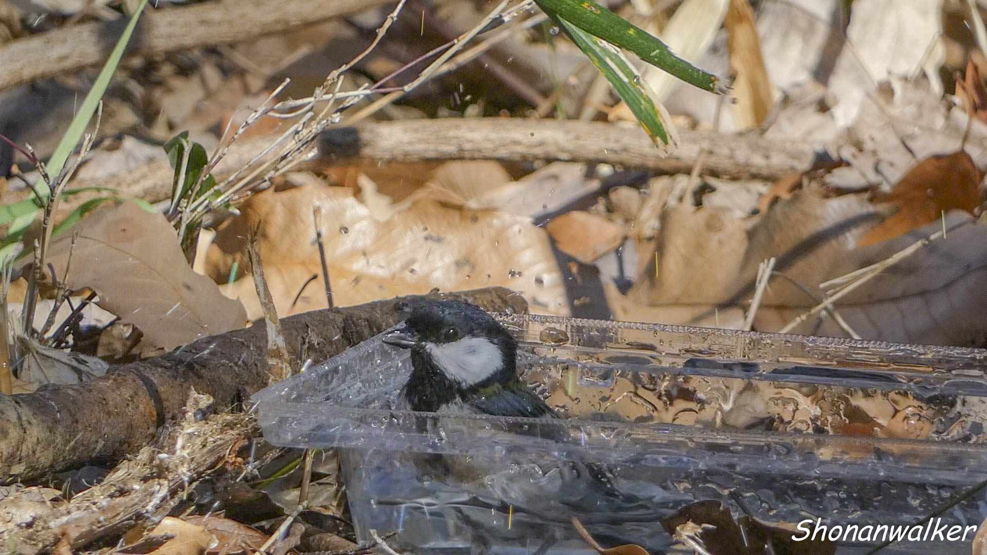 小生自身驚いている。事前に給水する場面もなく、シジュウカラがいきなり水に浸かったからである。