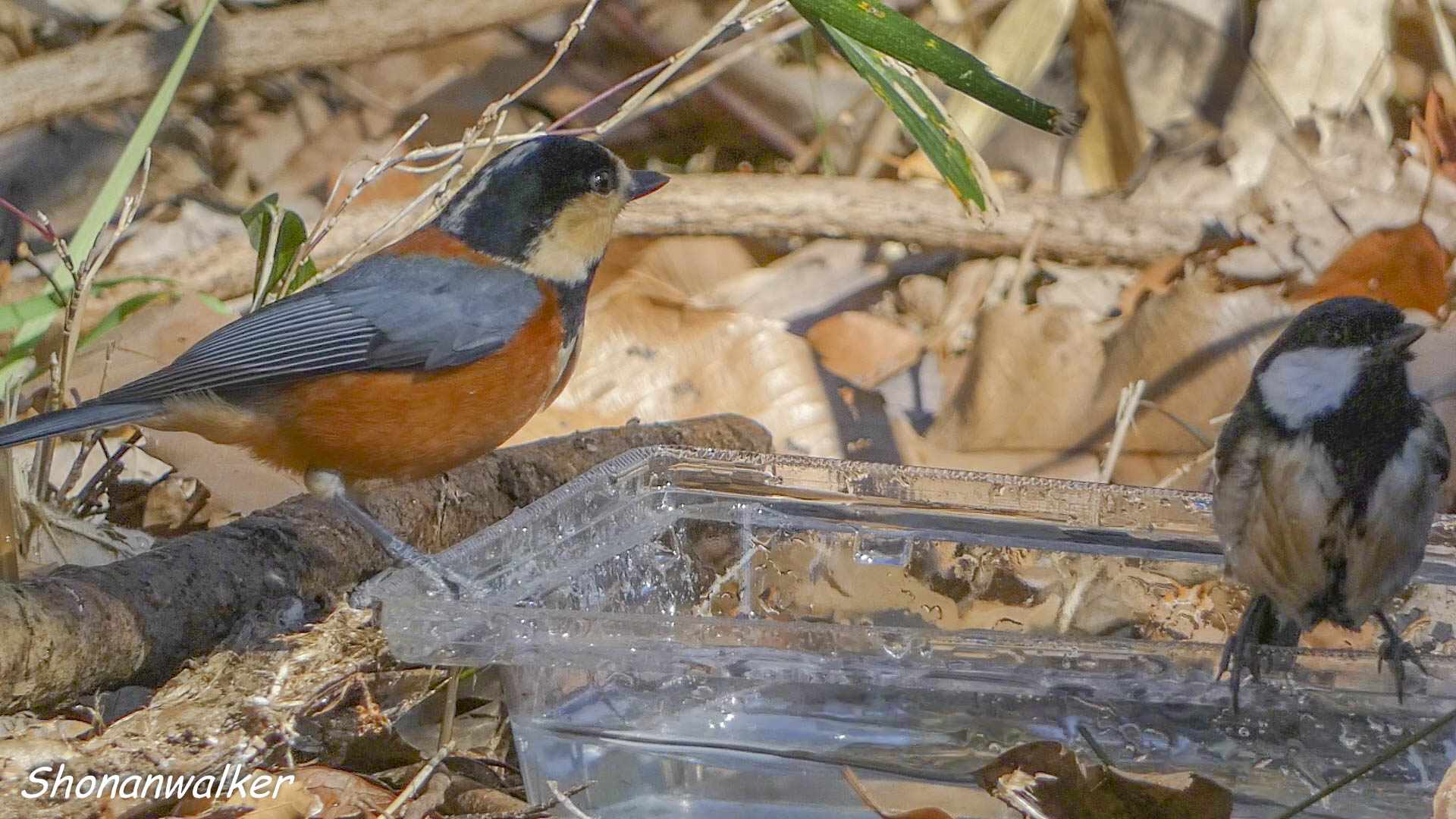 ヤマガラの行動を近くで見ていたのか、いきなりシジュウカラがヤマガラの給水の合間に降下してきた。