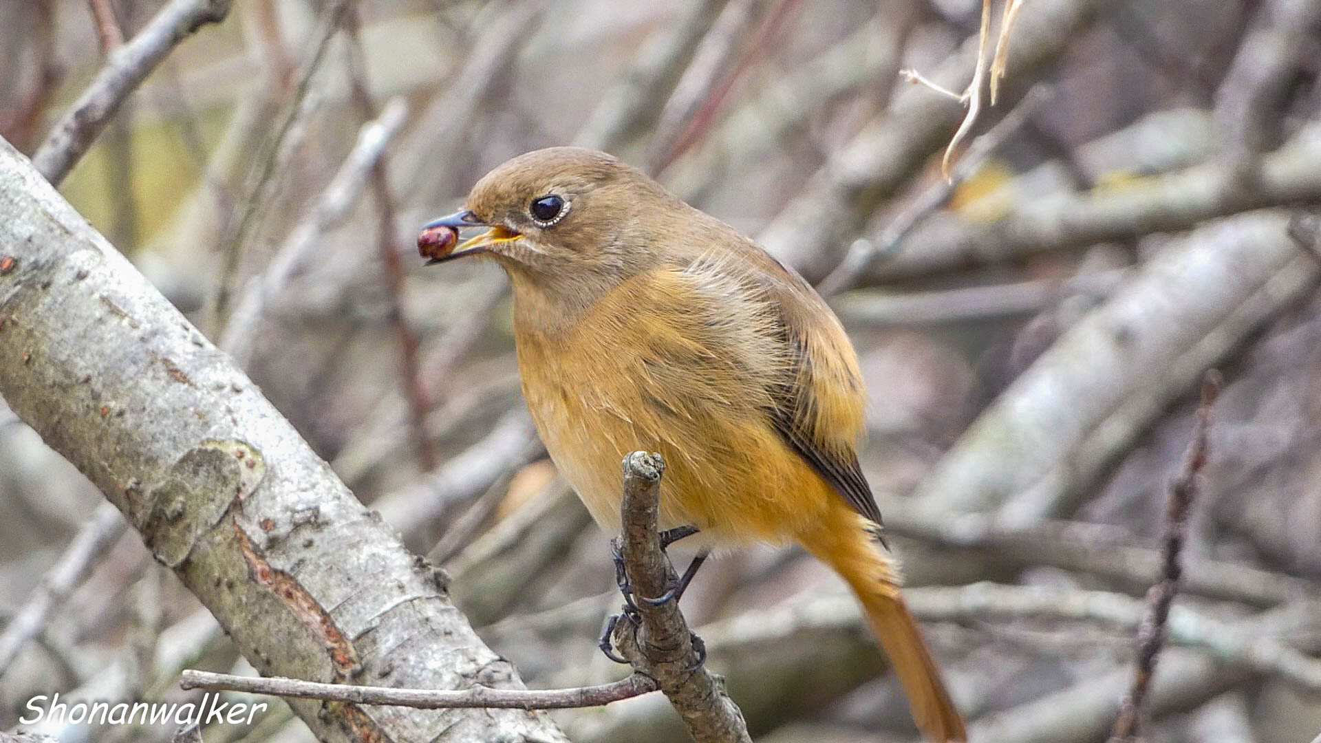 このジョウビタキの個体は近隣の木の実を食べてからこの場所で、5-6分の小休止を取る。