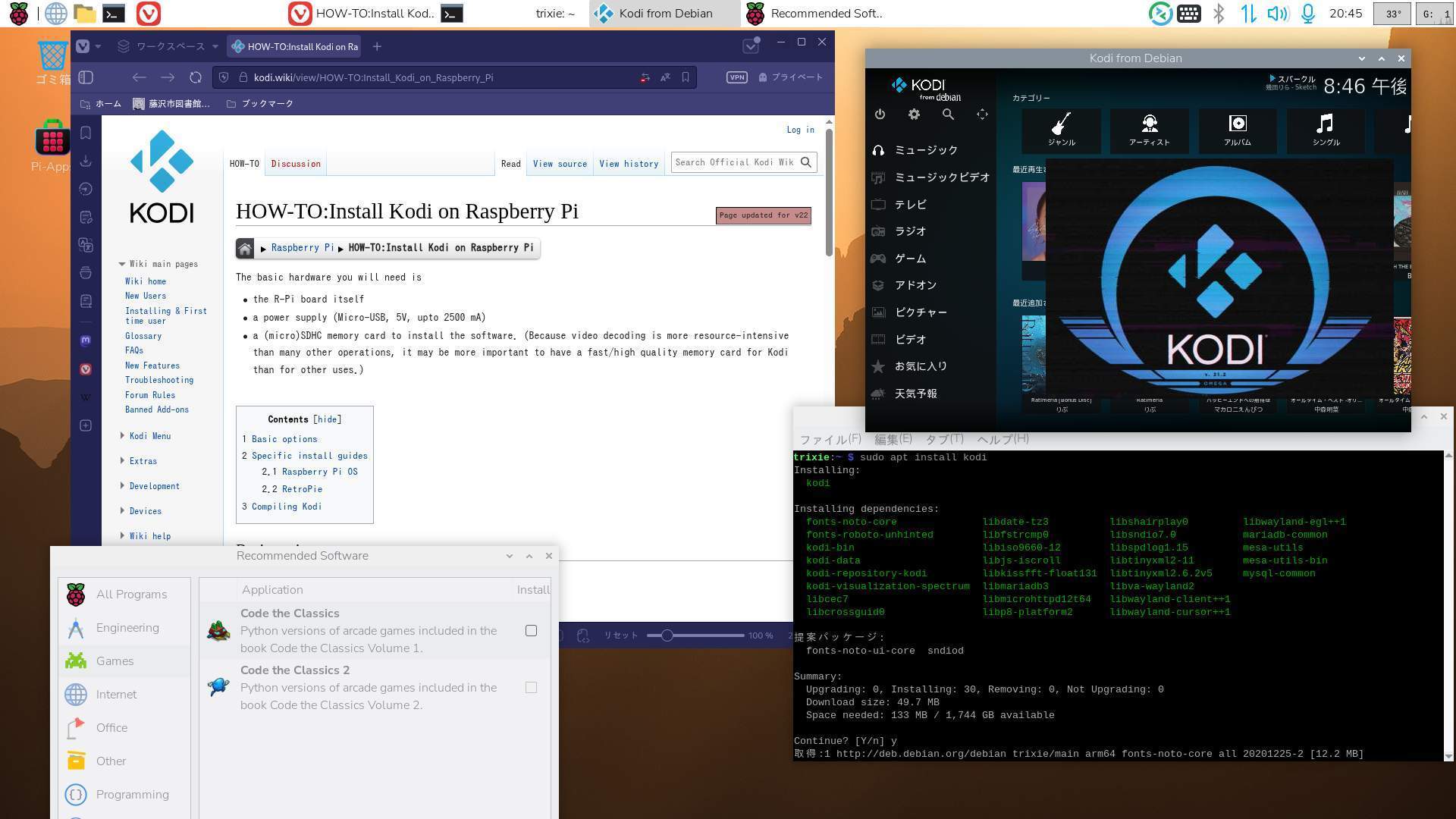 パッケージの名称が変わったようでKodi21は普通に【kodi】としてコマンドを打てばいいようだ。Pi-Appsからも利用可。