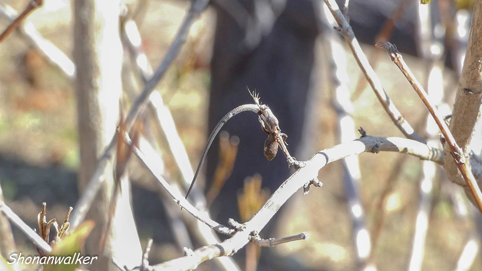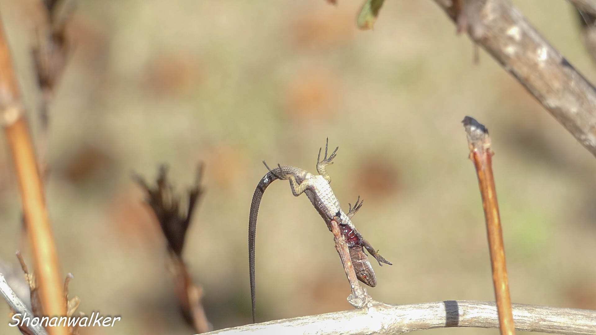 雌モズが獲物を獲ってきた。小さいトカゲのように見えた。