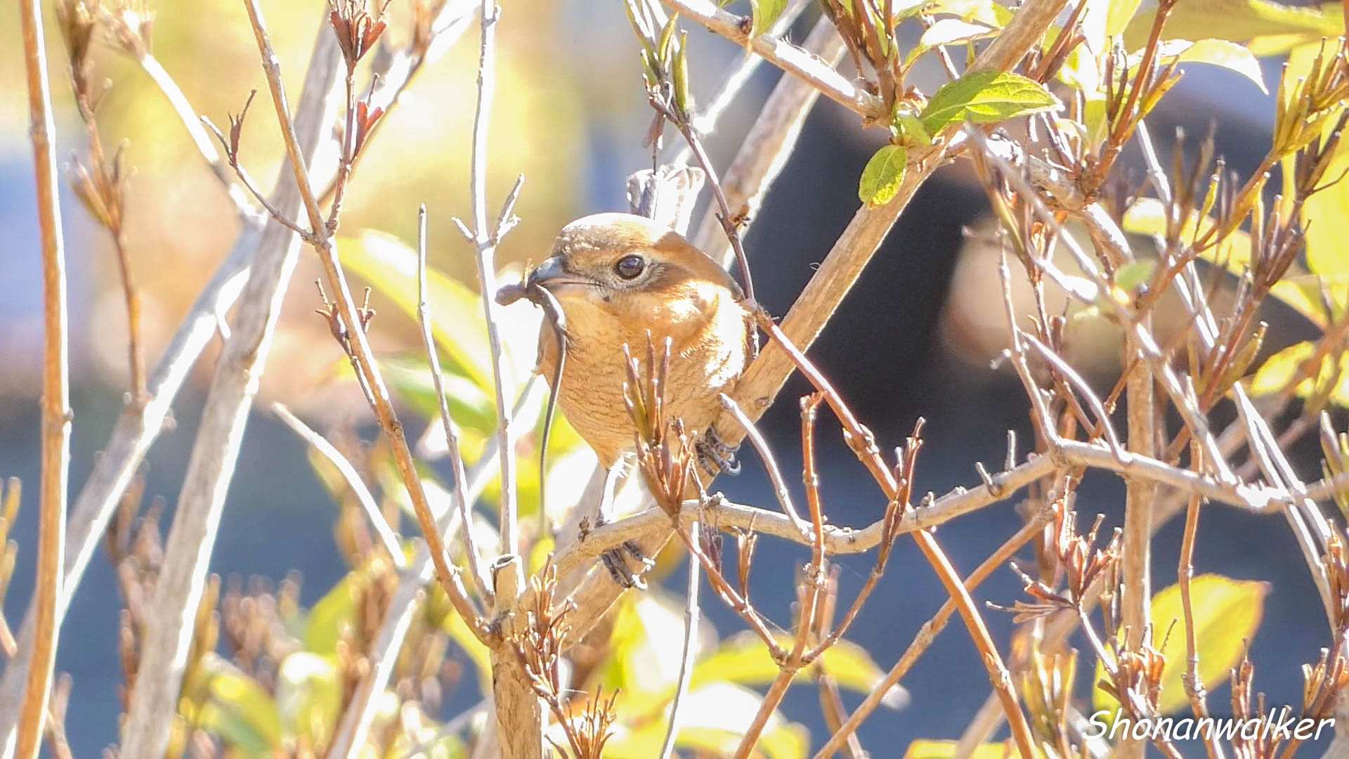 はやにえは雄のイメージが強いのだがそんなことは関係なく、雌雄共暖かい日はせっせと冬の準備という理由なのだろう。