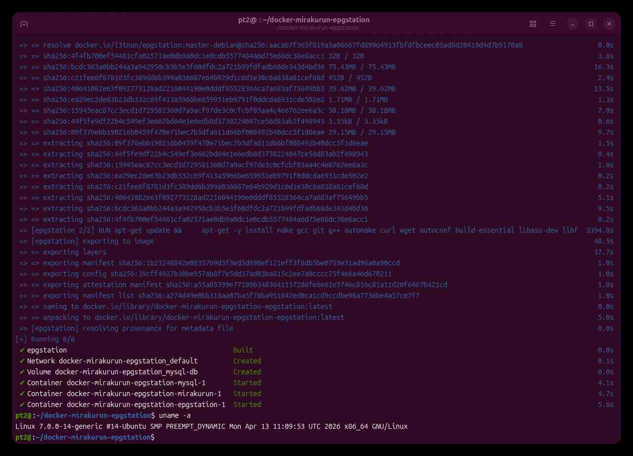 x64 Ubuntu 26.04.5 LTS+Docker (29.1.3)+mirakurun(3.9.0-rc.4) + EPGStation(v2.10.0)+PT2 にて